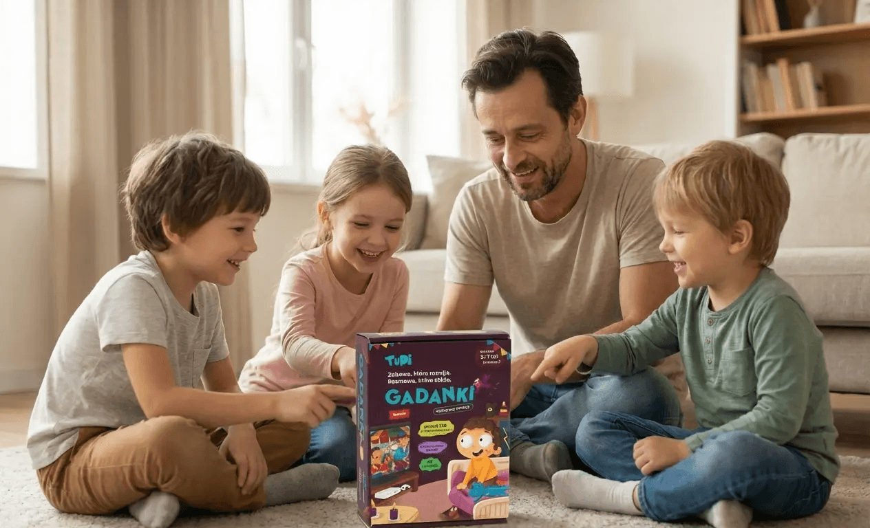 AI-generated lifestyle imagery — we used AI-generated visuals showing parents and children playing together (e.g., a mum playing Gadanki with her kids), making the experience feel real and relatable